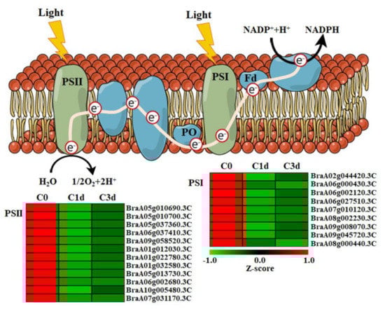 Effects of cold stress on the transcription levels of genes involved in the light reactions. C0, plants grown at 20 °C (control plants); C1d and C3d, plants subjected to cold stress (10 °C) for 1 day and 3 days, respectively. Red and green colors indicate ascending and descending Z-scores, respectively.