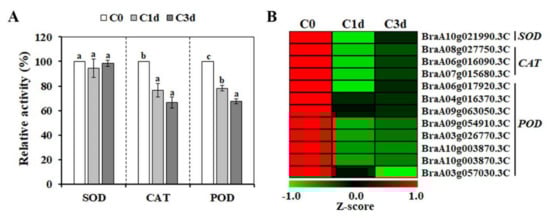 In higher plants, genotypic variation within a species influences the activation pattern of enzymatic antioxidant components [39,40,41,42,43]. For example, a cold-tolerant banana cultivar exhibits a significantly increased POD activity under cold stress, whereas a cold-sensitive cultivar exhibits a significantly decreased activity [39]. Genes encoding enzymatic antioxidant components display various expression patterns under abiotic stresses [44,45,46,47], implying redundant functions among the members of the same protein family. In the B. rapa genome, genes encoding 18 SODs, 7 CATs, and > 140 PODs have been identified [44,47]. Among them, 1 SOD, 3 CATs, and 8 PODs were identified as cold-induced DEGs in HtKc, and all the detected DEGs were down-regulated by cold stress (Figure 4B). This observation indicates that the decreased activity of POD or CAT in cold-stressed HtKc might be mediated through the down-regulation of genes encoding PODs or CATs.