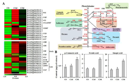 Effect of cold stress on the phenylpropanoid pathway. (A) Cold-induced differentially expressed genes involved in the phenylpropanoid pathway. (B) The levels of p-coumaric, ferulic, and sinapic acids were assessed using HPLC. The data are presented as mean ± SE of five independent experiments. Values with different letters are significantly different, according to Duncan’s multiple range test. C0, plants grown at 20 °C (control plants); C1d and C3d, plants treated cold stress (10 °C) for 1 day and 3 days, respectively. PAL, phenylalanine ammonia-lyase; C4H, cinnamate 4-hydroxylase; 4CL, 4-coumarate:CoA ligase; CCoAOMT, caffeoyl CoA 3-O-methyltransferase; COMT, caffeate/5-hydroxyferulate 3-O-methyltransferase; CCR, cinnamoyl-CoA reductase; CAD, cinnamyl alcohol dehydrogenase; SCT, sinapoylglucose:choline sinapoyltransferase; CHR, chalcone reductase; CHS, chalcone synthase; CHI, chalcone isomerase; F3H, flavanone 3-hydroxylase; F3′H, flavonoid 3′-hydroxylase; F3′5′H, flavonoid 3′5′-hydroxylase; FLS, flavonol synthase; DFR, dihydroflavonol reductase; LDOX, leucoanthocyanidin dioxygenase; UGT, UDP-glucuronosyl/glucosyl transferase.