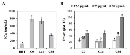 Chemical-based antioxidant activity was measured using the DPPH-radical-scavenging (A) and ORAC (B) assays. The DPPH-radical-scavenging activity and ORAC values are expressed as IC50 and μM of Trolox equivalents, respectively. The data are presented as mean ± SE of five independent experiments. Values with different letters are significantly different, according to Duncan’s multiple range test. C0, plants grown at 20 °C (control plants); C1d and C3d, plants treated cold stress (10 °C) for 1 day and 3 days, respectively.