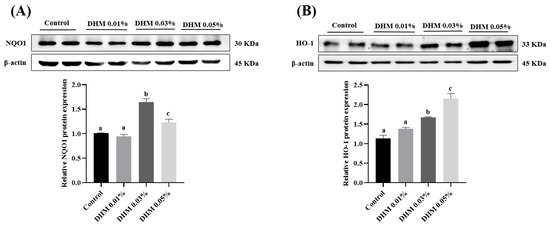 To explore the mechanism of DHM enhancing antioxidant capacity, we further examined the expression of an antioxidant-related protein. We focused on the Nrf2/HO-1 signaling pathway. As shown in Figure 1, dietary supplementation with 0.03% and 0.05% DHM significantly upregulated the protein expression of NQO1, HO-1, and nuclear Nrf2 in jejunum mucosa (p < 0.05).