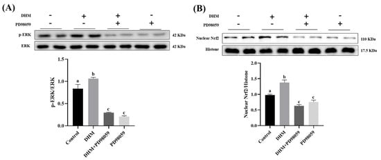 To determine whether the ERK signaling pathway is involved in Nrf2 activation, the PD98059, a specific inhibitor of ERK, was used to inhibit the ERK signaling pathway in IPEC-J2 cells. Our results showed that treatment with 20 μmol/mL DHM significantly upregulated the protein expressions of p-ERK, nuclear Nrf2, and HO-1, which were eliminated by the PD98059 (Figure 4) (p < 0.05).