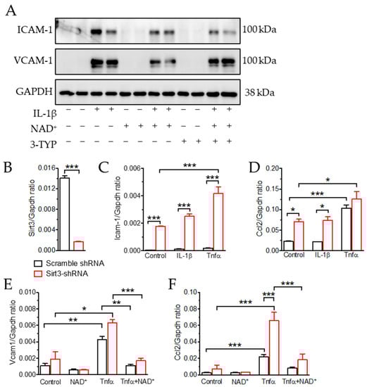 NAD+ attenuated inflammatory response in endothelial cells. (A) Representative Western blot showing the expression of adhesion molecules VCAM-1 and ICAM-1 in HUVECs treated with 10 ng/mL of IL-1β with or without 1 mmol/L NAD+, 100 µmol/L 3-Typ for 16 h. +: in the presence of the indicated treatment; −: without the indicated treatment. (B) mRNA of Sirt3 to confirm the efficacy of shRNA knockdown in mBMECs. (C,D) mRNA expression of Icam1 and Ccl2 in mBMECs with stable expression of either scrambled (Scr) or Sirt3 shRNA (sh-Sirt3) with or without 10 ng/mL of TNFα or 10 ng/mL of IL-1β treatment for 16 h. (E,F) mRNA expression of Vcam1 and Ccl2 in mBMECs with stable expression of either scrambled (Scr) or Sirt3 shRNA (sh-Sirt3) treated with 10 ng/mL of TNFα with or without 1 mmol/L NAD+ for 16 h. Data are means ± SEM. * p < 0.05, ** p < 0.01, *** p < 0.001 between groups.
