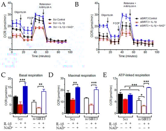 On the basis of the well-known function of NAD+ and SIRT3 in regulating mitochondrial function, which is also related to vascular inflammation, next, we examined mitochondrial respiration in HUVECs. The effect of SIRT3 inhibition by siRNA at the basal level was significant in ATP-linked respiration, but not basal or maximal respiration (Figure 2A–E). The effect of IL-1β to suppress mitochondrial respiration was not significant in control (Scr) HUVECs (Figure 2A–E), whereas, in si-SIRT3-transfected HUVECs, IL-1β was able to suppress ATP-linked respiration (Figure 2E), suggesting that inhibition of SIRT3 sensitized ECs to the effect of IL-1β on inhibiting mitochondrial function. In addition, co-treatment with NAD+ was able to enhance basal, maximal, and ATP-linked respiration in both control and SIRT3 knockdown cells. NAD+ was also able to reverse the effect of IL-1β (Figure 2C–E). These results indicated that, although SIRT3 inhibition impaired mitochondrial function in the presence of a stressor, NAD+ was still able to boost mitochondrial function and increase the reserve bioenergetic capacity of ECs under both homeostasis and stress, irrespective of Sirt3 expression.