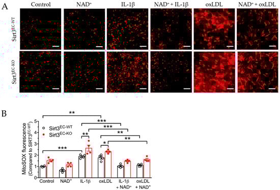 NAD+ attenuated oxidative stress in the endothelium. (A) Representative images of en face preparation for MitoSOX fluorescence in aortic endothelium isolated from Sirt3EC-WT and Sirt3EC-KO mice treated with 10 ng/mL of IL-1β, or 50 µg/mL of oxLDL with or without 1 mmol/L of NAD+ for 16 h. Scale bar = 200 µm. (B) Quantification of MitoSOX fluorescence. n = 4 mice in each group. Data are means ± SEM. * p < 0.05, ** p < 0.01, *** p < 0.001 between groups.