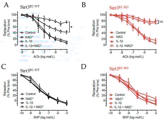 On the basis of the anti-inflammatory and antioxidant effects of NAD+ on ECs, which are independent of SIRT3, we next explored whether NAD+ alleviates vascular endothelial dysfunction in a similar manner because oxidative stress is closely associated with endothelial dysfunction. We used a vascular reactivity test to measure endothelium-dependent relaxation (EDR) in the mouse aorta in response to ACh, as an indication of endothelial function. Moreover, endothelium-independent relaxation in response to nitric oxide donor SNP was also measured to verify that vascular smooth muscle function was unaffected. The aortic rings were isolated from Sirt3EC-WT and Sirt3EC-KO mice. IL-1β similarly impaired EDR (an ~80% reduction, indicated by an open triangle in Figure 4A,B) in the aortic rings of both the Sirt3EC-WT and Sirt3EC-KO mice. NAD+ alone (indicated by the open square) did not show any effect in the aortic rings of either genotype. Co-treatment of NAD+ with IL-1β partially improved EDR in Sirt3EC-WT mice (Figure 4A), but not in Sirt3EC-KO mice (Figure 4B). SNP-induced relaxation was similar among all the groups (Figure 4C,D). These results suggested that the effect of NAD+ in improving endothelial function was, at least partially, dependent on SIRT3 expression.