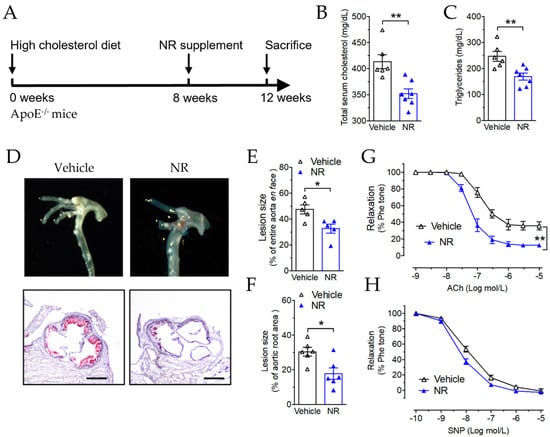Nicotinamide riboside (NR) attenuates high-cholesterol diet-induced atherosclerosis in ApoE−/− mice. (A) Schematic experimental outline for NR treatment on ApoE−/− mice. ApoE−/− mice were fed a high-cholesterol diet for 8 weeks and then were randomly divided into two groups, i.e., the vehicle (water) and NR (400 mg/kg/day), and were fed through oral gavage for another 4 weeks. Mice were sacrificed at 12 weeks and atherosclerotic plaques were quantified. (B,C) Total cholesterol (B) and triglyceride levels in the plasma from ApoE−/− mice treated with vehicle or NR. (D–F) Representative images (D) and quantification of lipid deposition in the whole aorta (E) and the aortic root cross-section (F) were measured by Oil Red O staining. Scale bar = 500 μm. (G,H) EDR (G) and SNP-induced relaxation (H) in aortas. n = 5 mice per group. Data are means ± SEM. * p < 0.05, ** p < 0.01 between groups.