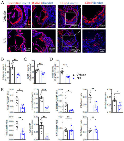 Nicotinamide riboside (NR) attenuated macrophage infiltration and vascular inflammation in ApoE−/− mice. (A) Immunofluorescence staining of E-selectin and ICAM-1 (endothelial activation markers), and CD68 (macrophage marker) in frozen aortic root sections. Scale bar = 500 µm. n = 6. (B–D) Quantification of the immunofluorescence staining E-selectin (B), ICAM-1 (C), and CD68 (D). (E) qRT-PCR result showing mRNA expression of genes involved in vascular inflammation, including Vcam-1, Icam-1, E-Selectin, IL-1β, Tnfα, IL-8, Nlrp3, and Sirt1 and Sirt3 in the aortas from ApoE−/− mice treated with vehicle or NR. n = 5–7 per group. Data are means ± SEM. * p < 0.05, ** p < 0.01, *** p < 0.001 between groups.