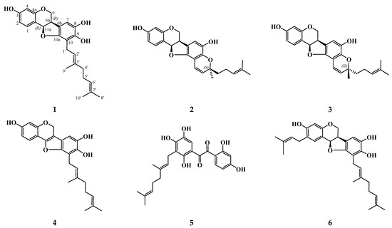 The Far Eastern medicinal plant Lespedeza bicolor and other Lespedeza species produce unusual biologically active prenylated pterocarpans and coumestans, possessing strong antioxidant and neuroprotective activity [19,20,21,22,23,24,25,26,27,28]. Pterocarpan 1-methoxylespeflorin G11 from L. bicolor has recently been reported to exhibit neuroprotective effects against glutamate-induced neurotoxicity in neuronal HT22 cells. This neuroprotective activity was shown to be due to inhibition of oxidative stress and apoptosis [25]. We should note that arylbenzofuran and coumestan compounds did not protect HT22 cells from glutamate-induced cell death, whereas the pterocarpan-type compounds exhibited a significant neuroprotective effect against glutamate neurotoxicity [25].