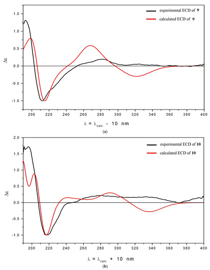 A comparison of the experimental and theoretical ECD spectra obtained for 9 and 10 is presented in Figure 2a,b. The positions and relative intensities of individual bands in the characteristic region 200 ≤ λ ≤ 300 nm are well-reproduced. The discrepancies in properties of Δεcalc (λ) and Δεexp (λ) occur in the long-wave region λ ≥ 300 nm, caused to some extent by underestimation of the contribution to the Δεcalc (λ) from the E+ conformations (Schemes S60–S61, Figure S62, Supplementary data). Thus, we performed several simulations of the averaged ECD spectrum for 9, in which relative amounts of the E− and E+ conformations were varied manually. We found that the shapes, positions, and relative intensities of individual bands in the characteristic region 200 ≤ λ ≤ 300 nm are refractory to these variations, while they change dramatically in the λ ≥ 300 nm region Schemes S60–S61, Figure S62 (S61–S62, Supplementary data). We previously observed analogous behavior for compound 2 [24].