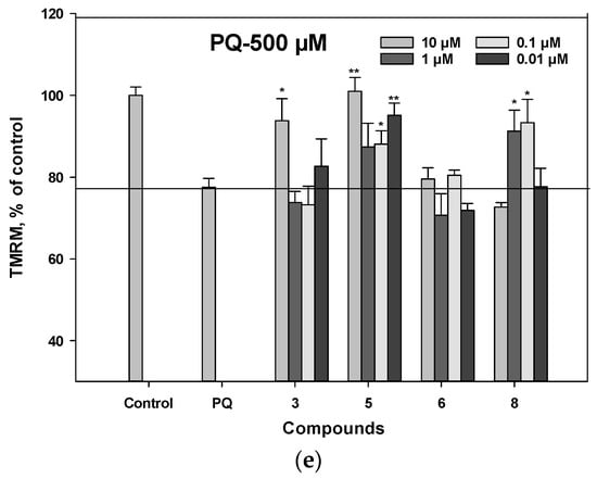 We studied the effect of polyphenolic compounds from L. bicolor on PQ-induced mitochondrial dysfunction. The 23% decrease in tetramethylrhodamine methyl (TMRM) fluorescence after a 1 h exposure of Neuro-2a cells with PQ indicates that PQ causes depolarization of the mitochondrial membrane (Figure 3e). Among the tested compounds, pterocarpan 3 and stilbenoid 5 at a concentration of 10 µM were the most effective in this assay and increased the value of mitochondrial membrane potential by 16% and 23%, respectively.