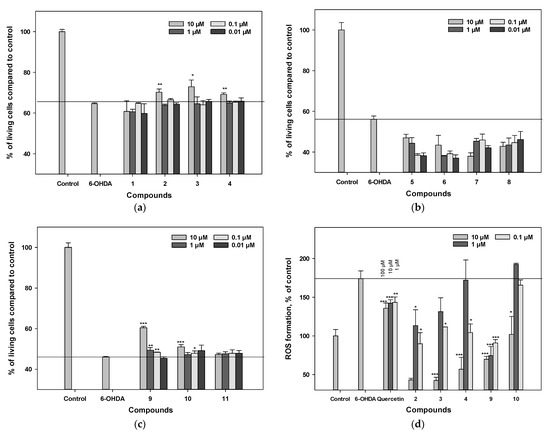 Compounds 9 and 10 increased the percentage of living Neuro-2a cells after treatment with rotenone by 10.4% and 13.2%, respectively, compared to rotenone-treated cells (p < 0.05). The other compounds did not show significant improvement in this assay (Figure 3a–d).
