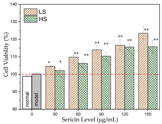 The murine hepatocyte cell line AML12 is derived from the liver of transgenic mice overexpressing a transforming growth factor α (TGFα) [46] and has mainly been used for studies on lipid metabolism and liver injury [40,46]. Here, the damage to AML 12 cells under a high glucose environment is mainly characterized. After AML12 cells were stimulated by 30 mmol/L glucose, the protective effects of the two sericins on the oxidative stress of the cells in a high-glucose environment were investigated. In this experiment, the CCK8 method was used to assess cell proliferation and toxicity. As shown in Figure 1, as the concentration of sericin increased, the viability of AML12 cells gradually improved. Under the same treatment concentration, the protective effect of LS on the viability of AML12 cells was superior to that of HS. When the sericin concentration increased to 150 μg/mL, the cell viability of AML12 reached the highest value. This demonstrates that sericin, especially the LS prepared using the Ca(OH)2-ultrasonic degumming method, has a strong protective effect against oxidative stress in AML12 cells in a high-glucose environment.