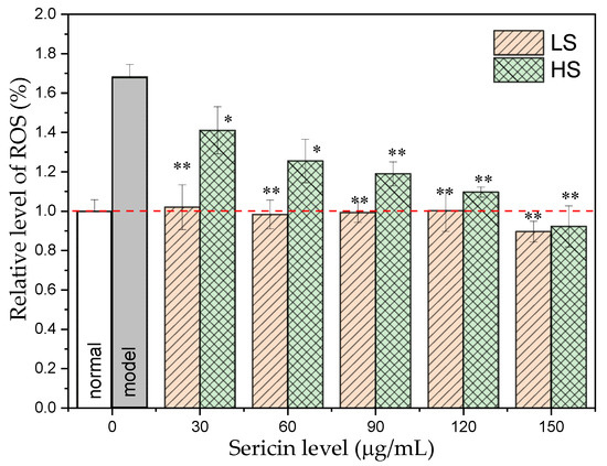 In this experiment, a high-glycemic medium containing 30 mmol/L glucose was used to mimic the formation of a high-glycemic environment in the body, and the AML12 cells were exposed to different concentrations of HS and LS high-glycemic media. After 24 h, using the viability of the AML12 cells without sericin as a control, the addition of both HS and LS enhanced the viability of AML12 cells in a high-glucose environment, and both exhibited a dose-dependent effect. This situation is similar to the situation in which AML12 cells are induced to produce endoplasmic reticulum stress by soft acid [57], which causes an increase in the level of intracellular ROS, leading to a lipid toxicity of AML12 cells and triggering apoptosis. In this experiment, the ROS level of AML12 cells in the high-glucose treatment group was significantly (1.6 times) higher than that in the normal group (p < 0.01). After adding two different concentrations of sericin, the level of intracellular ROS decreased significantly. In comparison with the two sericins, the LS group decreased the level of ROS in AML12 cells more significantly. With increased HS concentration, the intracellular ROS level of AML12 in the HS group gradually decreased, and the intracellular ROS level of AML12 exposed to 150 μg/mL HS treatment was only 98% of that of the normal group. After co-incubation with LS (30–150 μg/mL), the ROS level in AML12 cells returned to normal levels. This shows that sericin, especially the small-molecular-weight sericin prepared using the calcium hydroxide degumming method, has a strong protective effect against the oxidative stress caused by AML12 cells in a high-glucose environment.