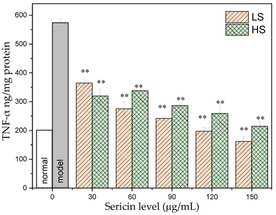 TNF-α was first discovered by researchers in macrophages, which can induce hemorrhagic necrosis of tumor tissues and thereby inactivate tumor cells. TNF-α is closely related to immune regulation and inflammatory response and can be used to evaluate drug treatment efficacy. As shown in Figure 3, the TNF-α level in AML12 cells of the normal group was 201.13 ± 4.73 ng/mg prot. After high glucose induction, TNF-α in AML12 cells increased significantly to 574.04 ± 13.96 ng/mg prot, which was 1.87 times higher than the level in the normal group. After adding two different concentrations of sericin, the intracellular TNF-α content was significantly reduced, and both exhibited obvious dose-dependent effects. Compared with the two sericins, the LS group reduced the content of TNF-α in AML12 cells more significantly. As HS concentration increased, the TNF-α content in the AML12 cells of the HS group gradually decreased, and the TNF-α content in AML12 cells treated with 150 μg/mL HS was 214.24 ± 17.5 ng/mg prot, returning to normal levels. With increased LS concentration, the TNF-α content in the AML12 cells of the LS group decreased significantly, and the TNF-α contents in the AML12 cells exposed to 120 and 150 μg/mL LS treatments were 197.06 ± 13.1 ng/mg prot and 161.83.06 ± 16.1 ng/mg prot, respectively, which were lower than normal levels. This indicates that the two sericins, especially LS, may slow down the inflammatory response of AML12 cells and even in the entire body by lowering TNF-α levels.