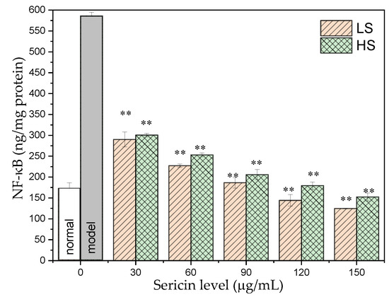 NF-κB is a DNA-protein complex widely present in animal cells, which can regulate DNA transcription and affect the cell’s response to external factors, such as inflammatory factors. NF-κB participates in infection response, immunity, development, cancer suppression, and other activities. As shown in Figure 5, the content of NF-κB in AML12 cells of the normal group was 172.83 ± 13.31 ng/mg prot. After high glucose induction, the NF-κB level in the AML12 cells significantly increased to 585.83 ± 8.95 ng/mg prot, which was 3.39 times higher than that of the normal group. After adding two different concentrations of sericin, the intracellular NF-κB content decreased significantly, and both concentrations showed obvious dose-dependent effects. Comparing the two sericins, the LS group reduced the content of NF-κB in AML12 cells more significantly. With increased HS concentration, the content of NF-κB in the AML12 cells of the HS group gradually decreased, and the content of NF-κB in the AML12 cells treated with 120 μg/mL HS was 179.23 ± 8.93 ng/mg prot, returning to normal levels. The content of NF-κB in AML12 cells treated with 150 μg/mL HS was 152.39 ± 9.51 ng/mg prot, which were lower than normal levels. With increased LS concentration, the NF-κB content in the AML12 cells of the LS group decreased significantly, and the NF-κB contents in the AML12 cells under the levels of 120 and 150 μg/mL LS treatments were 144.15 ± 13.85 and 124.8 ± 0.21 ng/mg prot, respectively, which were lower than normal levels. This indicates that the two sericins may slow down the inflammatory response of the AML12 cells and in the entire body by lowering NF-κB.