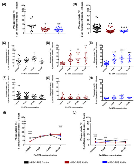 hiPSC-RPE cells derived from AMDa and AMDe patients had a lower non-specific phagocytosis activity (8.34 ± 1% and 8.07 ± 1% for 1 µm beads, respectively, 5.93 ± 1.4% and 4.90 ± 1.6% for 2 µm beads, respectively) than hiPSC-RPE Control cells (16.18 ± 2.4% for 1µm beads and 11.65 ± 1.7% for 2 µm beads, respectively) after 3 h of bead exposure (Figure 1A,B). Surprisingly, oxidative stress exposure leads to an increase in the 1 μm beads’ non-specific phagocytosis after 3 h POS exposure in both hiPSC-RPE Control (increased from 16.18 ± 2.4% to 23.53 ± 1.9% with 10 mM of FeNTA) and AMD cells (20.41 ± 3.3% for AMDa and 20.72 ± 3.2% for AMDe, 5 mM of Fe-NTA) (Figure 1C–E). Moreover, a higher 1 µm bead non-specific phagocytosis activity in hiPSC AMDa/e compared to hiPSC-RPE Control was observed (Figure 1I). In contrast, there was no effect of Fe-NTA treatment on non-specific phagocytosis of 2 μm beads for all cell lines after 3 h POS exposure (Figure 1F–H). However, the 2 µm beads’ non-specific phagocytosis activity of hiPSC-RPE Control remained higher than AMDe cells (5 mM) and AMDa cells (5, 10 and 15 mM of FeNTA) (Figure 1J). No difference was observed for 24 h POS exposure in all hiPSC-RPE cell lines under basal and oxidative stress conditions (data not shown).