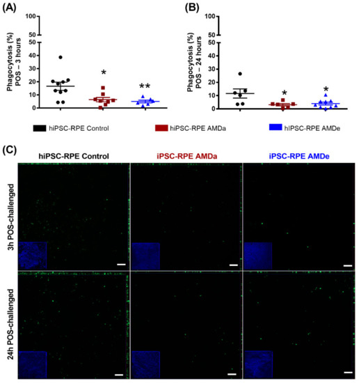 Age-related macular degeneration (AMD) is the first cause of blindness in the elderly population in developed countries, representing almost 15% of causes of blindness among adults aged ≥ 50 years in Western Europe [1]. With progressive aging of the population, the number of people with AMD in 2040 is projected to be 288 million [2]. The exudative form of AMD (AMDe) is characterized by choroidal neovascularization with subsequent bleeding and fluid exudation into the retina, while the atrophic form (AMDa) is characterized by retinal pigment epithelium (RPE) apoptosis associated with choriocapillaris atrophy and overlying photoreceptors degeneration [3,4]. AMD is a multifactorial complex disease, the major risk factors for both forms being ocular factors (age-related maculopathy) and genetic and environmental factors such as smoking [5,6]. Somatic cells derived from induced pluripotent stem cells (iPSC) can represent a useful source of an in vitro cellular model for diseases when derived from affected individuals, particularly in the cases of scarce animal or appropriate cellular models [7,8,9]. In this context, RPE cells derived from healthy and AMDa/e patients were previously obtained [10]. RPE cells are highly polarized and pigmented monolayer cells essential for normal vision [11]. RPE cells derived from individuals suffering from AMDa express a typical disease phenotype in a pro-oxidant environment when compared to hiPSC-RPE obtained from healthy individuals. hiPSC-RPE AMDa cells are more sensitive to iron exposure and have presented with dysregulation of lysosomal enzyme activities under oxidative stress condition [10]. Many studies have reported that RPE cell alterations induced by aging (i.e., mitochondrial damages, lysosomal dysregulation, accumulation of lipofuscin….) may play a role in the pathophysiology of this disease [11,12,13]. Oxidative stress is possibly one of the most critical factors able to induce pathological cascade leading to AMD development [14]. In our previous study, we demonstrated that hiPSC-RPE cells derived from AMD patients are more sensitive to iron exposure and dysregulate lysosomal enzyme activities under oxidative stress conditions [10]. Lysosomal activity is required for the digestion of photoreceptor outer segments (POS), the last stage of RPE phagocytosis [15,16]. RPE cells are specialized phagocytes playing a critical role in POS renewal [17,18]. Any imbalance in POS phagocytosis by RPE cells causes debris accumulation over time, ultimately harming photoreceptors [14,19]. RPE phagocytosis dysfunction is observed in the Royal College of Surgeons rats, an animal model of recessively inherited retinal degeneration [20], leading to blindness within a few weeks postnatal [21]. Since the last decade, some evidence has suggested that oxidative stress and free radical damage in the RPE lead to impaired RPE phagocytic function and underlie AMD pathogenesis [22]. In this context and in line with previous studies, we aimed to better understand the phagocytosis impairment observed in our AMD model derived from iPSC.