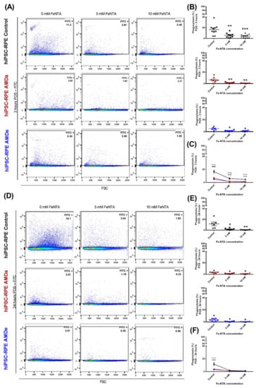 This study investigated phagocytosis activity in hiPSC-RPE cells derived from healthy control subjects, AMDa and AMDe patients in basal condition and under oxidative stress induced by intracellular accumulation of iron. The daily clearance phagocytosis of POS by the RPE is critical for photoreceptor function and vision [26]. Phagocytosis dysfunction of RPE cells has been observed in AMD, but given the state of our knowledge, it is not clear whether this phenomenon is causative or a consequence of AMD [16,22]. Recent studies have shown that RPE phagocytic activity decreased with age, which could be partially explained by lipofuscin and/or iron accumulation into the retina during the aging process [22,27,28]. In this study, we observed that both specific and non-specific phagocytosis activity was altered in hiPSC-RPE AMDa/e compared to hiPSC-RPE Control cells in basal condition without oxidative stress exposure. To the best of our knowledge, our results are the first to demonstrate that phagocytosis activity is dysregulated in a cellular model obtained from hiPSC-RPE cells derived from an AMDa/e patient’s blood cells.