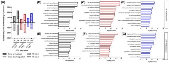 Gene expression after 3 or 24 h of POS incubation was analyzed by RNA-Seq based transcriptomic profiling. After 3 h of exposure, POS induced modifications of 2349 gene expressions with signals detectable in hiPSC-RPE Control: 783 genes (33.42%) were downregulated and 1098 genes (46.74%) were upregulated with a fold change of 2.5 or more difference. After 3 h POS exposure, we found 1892 genes with differential expression (DE) in hiPSC-RPE AMDa (557 downregulated—29.44% and 1115 upregulated—58.93%) and 1469 in hiPSC-RPE AMDe (541 downregulated—36.83% and 675 upregulated—45.95%) (Figure 3A). Following, 24 h POS exposure induced regulation of 3442 genes in hiPSC-RPE Control: 893 downregulated (25.94%) and 1593 upregulated (46.28%). For hiPSC-RPE AMD, 24 h POS exposure led to modification of 2725 genes for AMDa cell lines (728 downregulated—26.72% and 1185 upregulated—43.49%) and 2380 genes for AMDe cell lines (848 downregulated—35.63% and 860 upregulated—36.13%) (Figure 4A). The top 10 Gene ontology term analysis of this DE gene showed a significant enrichment of cellular function as part morphogenesis, microtubule-based process and regulation of GTPase activity in both 3 h (Figure 4B–D) and 24 h POS exposure (Figure 4E–G).