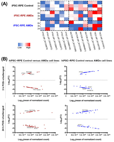 Analysis of specific mTOR/PI3K-AKT/MEK-ERK pathway with RNA-seq. Heat map of 3 enriched genes (PTK2, TSC2, RICTOR) involved in GTPase regulation pathway in hiPSC-RPE Control, AMDa and AMDe cells in basal condition and after 3 and 24 h POS exposure (A). Volcano plot of differentially expressed genes between hiPSC-RPE Control and AMDa cells and between hiPSC-RPE Control and AMDe cells after 3 and 24 h POS exposure (B). hiPSC-RPE Control cells N = 6, hiPSC-RPE AMDa cells N = 6, hiPSC-RPE AMDe N = 3.