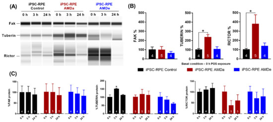 Analysis of expression levels and activity of proteins after POS exposure. Western blot analysis of fak, rictor and tuberin (A) and Western blot quantification (B,C) on hiPSC-RPE Control (N = 4), AMDa (N = 5) and AMDe cells (N = 4) (one analysis per cell line). Statistical analysis: one-way ANOVA and post hoc Turkey’s multiple comparison. Comparison of each dose between hiPSC-RPE Control and AMD cells (B) or for each cell line between 0 and 3 h/24 h (C); * p < 0.05.