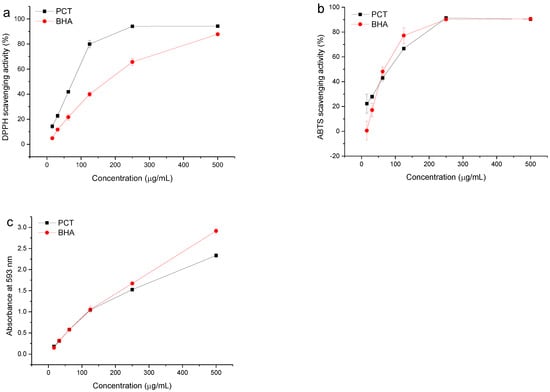 The free radical scavenging activities of PCT and the reference standard BHA were determined by the DPPH assay. A lower IC50 value indicates a higher antioxidant activity. The IC50 value of PCT (81.16 ± 3.16 µg/mL) was superior to that of the reference BHA (169.62 ± 11.36 µg/mL). Moreover, the activity was directly proportional to the concentration of tannins in the investigated sample (Figure 2a). An increase in the DPPH-scavenging activity in a concentration-dependent manner indicated that the PCT possesses potent free radical scavenging activity.