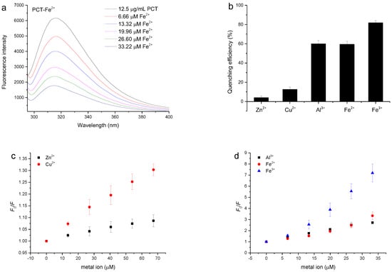 The interactions between metal ions and the PCT were studied using fluorescence spectroscopy []. Fluorescence quenching was the decrease in the quantum yield of the fluorophore caused by a variety of molecular interactions with quencher molecules, such as ground state complex formation, molecular rearrangement, energy transfer, and excited-state reactions []. The fluorescence of condensed tannins originated from its structural units, including (–)-epigallocatechin (EGC) and (–)-epicatechin (EC) units []. As previously reported by Zhang, Xu, Wang, and Hu [], Sorghum bicolor Moench proanthocyanidin showed a strong fluorescence emission with a peak at 320 nm based on the excitation wavelength, and its fluorescence intensity gradually decreased with the addition of Zn2+, Cu2+, and Al3+. This was also observed in our experiment when studying metal ions titrated into the PCT solution. Figure 4a shows the attenuation of PCT fluorescence when Fe2+ was continuously added to 12.5 µg/mL PCT solution at a pH of 6.0 achieved with an acetate buffer, and this attenuation was also observed when Zn2+, Cu2+, Al3+, and Fe3+ were titrated into the PCT solution (Figure S2).