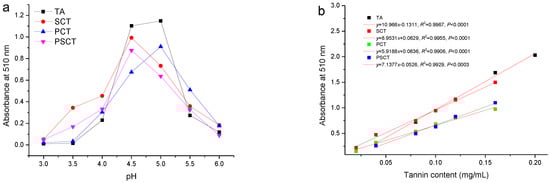 For determining the ideal pH for BSA tannin precipitation, tannins extracted from plum fruits, Chinese gallnut, sorghum grain, and P. strobilacea were treated at different pH, and the impact on their protein-precipitating capacity was investigated. Note that the ideal pH is the value at which a tannin–protein complex forms the greatest amount of precipitation. Figure 5a illustrates the effect of pH on the precipitate when BSA reacts with the purified tannins via the protein precipitation assay. It indicates that BSA was effectively precipitated at pH 4.5–5.0 after the tannins were added. Naczk et al. [] reported a similar pH effect for condensed tannins obtained from canola hulls, evening primrose, and faba bean.