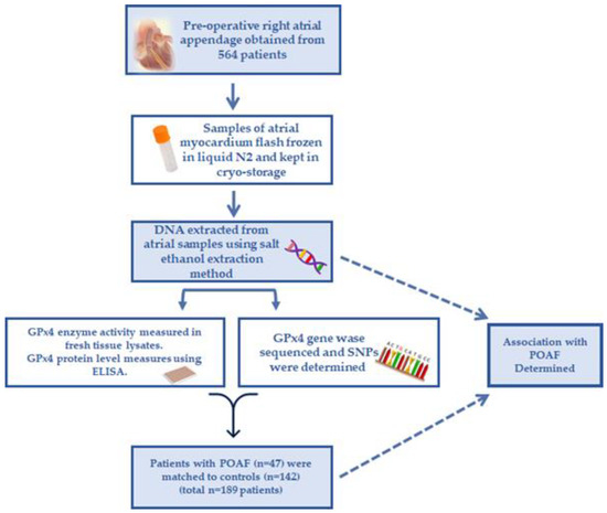 In this study, we tested the hypothesis that GPX4 variants are associated with POAF, and we also sought to determine if any variants were linked to altered GPx4 enzyme level and/or activity in human myocardium. To accomplish these objectives, we performed a genotype–phenotype analysis of GPx4 in samples of myocardium dissected from right atrial appendages collected from a cohort of patients undergoing non-emergent CABG and assessed the relationship between these variables and incidence of POAF.