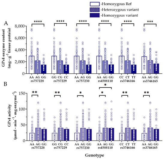 We performed a GPx4 genotype–phenotype analysis within the myocardial tissue samples and found six GPX4 variants which were significantly associated with substantially lower levels of myocardial GPx4 enzyme content as compared with the Referent nucleotide carriers (Figure 3A). Measuring both GPx4 content and activity in the same sample afforded us the ability to examine maximal GPx4 activity (in µmol/min) expressed per milligram of GPx4 enzyme, a more rigorous parameter for enzyme kinetic analysis then we showed in a previous report on MAO in human myocardium [37]. Intriguingly, despite the lower myocardial GPx4 enzyme levels in those patients carrying these particular GPX4 variants, GPx4 activity was significantly higher in some of these carriers as compared with Referents (Figure 3B).