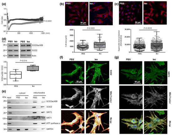 Characterization of mitochondrial oxidative stress in hypertrophied neonatal rat cardiomyocytes (NCMs). (a) Cell index quantification in untreated (black line) and Isoproterenol (Iso)-treated (gray line) NCMs by RTCA analysis. Cell index was recorded every 15 min (n = 4 independent isolation, in duplicate). (b) Hypertrophy was quantified in untreated- (PBS) (white box) or Iso-treated (gray box) NCMs for 24 h by immunofluorescence of alpha-actinin (red) and nuclei (blue) (top panels) and quantification of cell area (µm2) (bottom panel) (from 3 independent experiments and at least 273 cells). Oxidative stress was quantified in untreated (PBS) or Iso-treated NCMs for 24 h by fluorescence quantification of (c) mitochondrial superoxide anion with mitoSOX probes (red) (from 3 independent experiments and at least 236 cells) and by Western blot of (d) SOD2 acetylated on lysine 68 (SOD2acK68) or lysine 122 (SOD2acK122) on SOD2 ratio normalized to actin. (e) Representative images of SOD2acK68, SOD2 and sirtuins localized in mitochondria (validated by ATP synthase α) after subcellular fractionation of untreated (PBS) or Iso-treated-NCMs for 24 h. Representative images of (f) SOD2 (green) and (g) SIRT3 (green) localized in mitochondria (white) of untreated (PBS) or Iso-treated NCMs for 24 h. Colocalization appeared in merged images. Only significant p values are indicated from at least 3 independent experiments. Images were selected to represent the mean values of each condition.