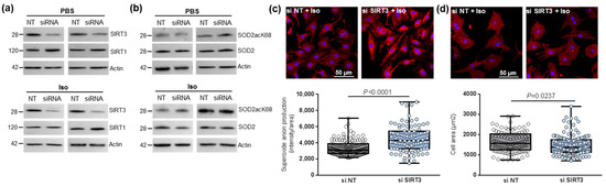 Effect of SIRT3 inhibition on SOD2 activation and mitochondrial oxidative stress in control and hypertrophied neonatal rat cardiomyocytes (NCMs). Control (PBS) or Iso-treated NCM were transfected without (gray box) or with (light blue box) SIRT3 siRNA for 72 h. Quantification by Western blot of SIRT3 and SIRT1 expression (a) and of SOD2acK68/SOD2 ratio and SOD2 expression (b) in Iso-treated NCM transfected with control or SIRT3 siRNA. Data were normalized on actin. (c) Mitochondrial superoxide anions production was detected after MitoSOX (red) and nuclei (blue) staining and quantified from 3 independent experiments and at least 92 cells. (d) Cell area was quantified from 3 independent experiments and at least 108 cells after alpha-actinin (red) and nucleus (blue) staining. Scale bar = 20 µm. Only significant p values are indicated from 3 independent experiments. Images were selected to represent the mean values of each condition.