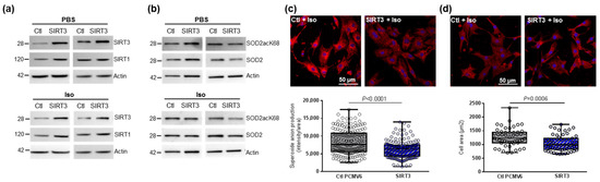 For SIRT3 sur-expression, the NCMs were transfected with the plasmid pCMV6 in which the nucleotide sequence of the SIRT3 protein (RN203062, OriGene, Rockville, MD, USA) was cloned. The empty pcMV6 plasmid (PS100001, OriGene) was used as a control. NCMs were plated (6.5 × 105 cells/well) in 6-well plates and were allowed to grow for 24 h in complete medium. The plasmid (3 μg) with 3 μL of lipofectamine 2000 transfecting agent (11668019, Thermo Fisher Scientific) were added per well.