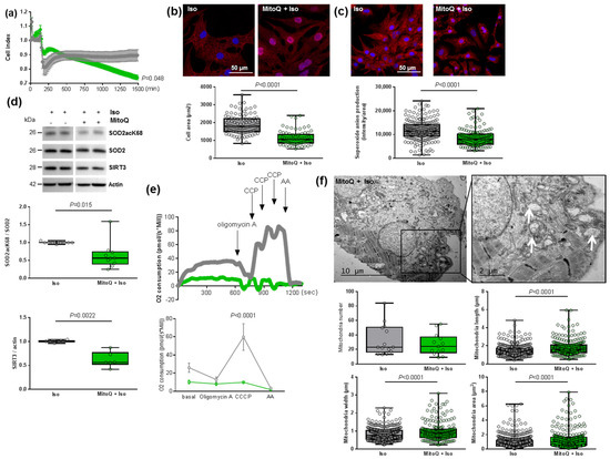 Effect of MitoQ in hypertrophied neonatal rat cardiomyocytes (NCMs). (a) Cell index quantification of hypertrophied NCM with pre-treatment with mitoquinone (MitoQ) (green line) or DMSO (as control) (gray line) by RTCA analysis. Cell index was recorded every 15 min (n = 4 independent isolation, in duplicate). (b) Hypertrophy was quantified in Iso-treated NCMs for 24 h with or without MitoQ by immunofluorescence of alpha-actinin (red) and nuclei (blue) (top panels) and quantification of cell area (µm2) (bottom panel) (from 3 independent experiments and at least 75 cells). (c) Oxidative stress was quantified in Iso-treated NCMs for 24 h with (+) or without (−) MitoQ by mitoSOX probe (red) (from 3 independent experiments and at least 133 cells). Quantification by Western blot of (d) SOD2 acetylated on lysine 68 (SOD2acK68) on SOD2 ratio and SIRT3 in Iso-treated NCMs for 24 h with or without MitoQ. Data were normalized to actin. (e) Representative oxygen consumption at basal level and after oligomycin, carbonyl cyanide m-chlorophenyl hydrazine (CCCP) and antimycin A (AA) addition (left panel) with quantification to characterize mitochondrial respiration (n = 9) (right panel) in Iso-treated NCMs with (green) or without (gray) MitoQ. (f) Ultrastructure of Iso-treated NCMs with or without MitoQ (magnification ×7000 with a scale bar of 10 µm (left images) and ×12,000 with a scale bar of 2 µm (right images)) and quantification of mitochondria number, length (µm), width (µm) and area (µm2). Arrows indicate examples of mitochondria for comparison. Only significant p values are indicated from at least 3 independent experiments. Images were selected to represent the mean values of each condition.