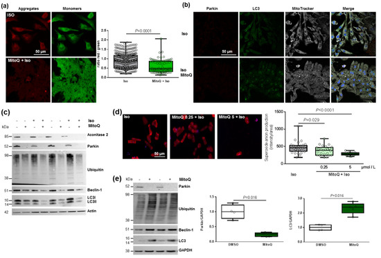 As mitophagy is the selective pathway of degradation of defective mitochondria, we investigated how MitoQ could affect this process. We first used the JC-1 dye and quantified a significant and stronger decrease in the red/green ratio in hypertrophied NCMs pre-treated with MitoQ (Figure 6a). We then quantified the proteins involved in the mitophagy/autophagy process. Interestingly, through immunofluorescence (Figure 6b) or Western blotting (Figure 6c and Table 3) we observed the complete suppression of parkin expression by MitoQ (alone or with Iso). MitoQ pre-treatment significantly decreased the expression of beclin-1 and increased the LC3II/I ratio without modulation of ubiquitinated proteins (Figure 6b,c and Table 3), suggesting a dysregulation of mitophagy/autophagy induced by MitoQ. To determine if autophagy is active, NCMs were treated with Bafilomycin at the same time as MitoQ and Iso. The inhibition of the autophagosome–lysosome fusion did not modulate the LC3II/LC3I ratio, suggesting that autophagy is inactive in hypertrophied NCMs pre-treated with MitoQ (Figure S4d).