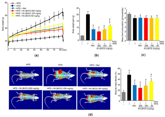 M-LB/CS prevents weight gain in mice fed high-fat diet (HFD). (a) Changes in body weight during the experimental period. Mice fed HFD were administered metformin (Met) or 50–200 mg/kg M-LB/CS for 84 days. Control mice were fed normal fat diet (NFD). (b,c) Body weight gain (b) and mean daily food consumption (c) were calculated as described in the Materials and Methods Section. (d) Representative images (left) and body fat mass density (right) were obtained from dual X-ray absorptiometry. The gray, black, blue, red, orange, and yellow bars in Figure 2b–d are NFD, HFD, HFD + Met, HFD + M-LB/CS 200 mg/kg, HFD + M-LB/CS 100 mg/kg, and HFD + M-LB/CS 50 mg/kg, respectively. a p < 0.01, b p < 0.05 versus NFD; c p < 0.01 versus HFD; d p < 0.05 versus HFD + Met.