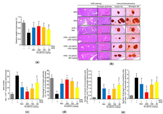 M-LB/CS alleviates hyperplasia of pancreatic islets. (a) Relative weight of pancreas was measured as described in Figure 3a. (b) Representative histological images. Tissue sections prepared from the pancreas were stained using either H&E (left) or antibodies to insulin and glucagon (right). Scale bars indicate 80 µm. (c–e) Islet number (c), zymogen granules (d), and insulin- and glucagon-immunoreactive cells (e) were counted using an automated image analyzer. The gray, black, blue, red, orange, and yellow bars in Figure 4a,c–e are NFD, HFD, HFD + Met, HFD + M-LB/CS 200 mg/kg, HFD + M-LB/CS 100 mg/kg, and HFD + M-LB/CS 50 mg/kg, respectively. a p < 0.01, b p < 0.05 versus NFD; c p < 0.01, d p < 0.05 versus HFD; e p < 0.01, f p < 0.05 versus HFD + Met. Ab, antibody.