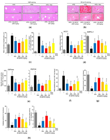 M-LB/CS mitigates abnormal hepatic changes induced by HFD. (a,b) Hepatic tissues were stained with either H&E (a) or Oil Red O (b). Scale bars indicate 80 µm. (c) Mean diameter of hepatocytes (left) and Oil Red O–stained regions in hepatic parenchyma (right) were counted using an automated image analyzer. (d) The levels of hepatic ACC1 (left) and AMPKα1 (right) mRNA were analyzed by qPCR. (e) Hepatic G6Pase and PEPCK activities were determined using a tissue homogenate and normalized by protein concentration. (f–h) The hepatic levels of malondialdehyde (f), glutathione (g), and catalase and superoxide dismutase activities (h) were assessed. The gray, black, blue, red, orange, and yellow bars in Figure 5c–h are NFD, HFD, HFD + Met, HFD + M-LB/CS 200 mg/kg, HFD + M-LB/CS 100 mg/kg, and HFD + M-LB/CS 50 mg/kg, respectively. a p < 0.01, b p < 0.05 versus NFD; c p < 0.01, d p < 0.05 versus HFD; e p < 0.01, f p < 0.05 versus HFD + Met. ACC, acetyl-CoA carboxylase; AMPK, AMP-activated protein kinase; G6Pase, glucose 6-phosphatase; PEPCK, phosphoenolpyruvate carboxykinase.