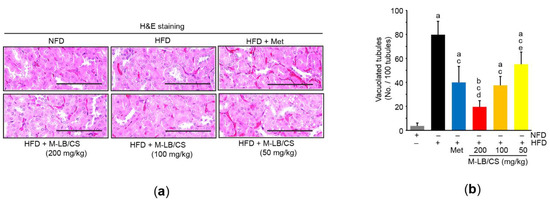 Although there were no differences in relative kidney weight among experimental groups (data not shown), the three different doses of M-LB/CS significantly reduced HFD-mediated increases in blood levels of creatinine and BUN. Reductions in blood biomarkers associated with kidney toxicity seen from 200 and 100 mg/kg M-LB/CS did not differ from those from Met (Table 2). In addition, histological observation of H&E-stained kidney tissue showed that M-LB/CS dose-dependently prevented the vacuolation of renal tubules induced by HFD supplementation, and the reduction of tubular vacuolation by 200 mg/kg M-LB/CS was more potent than that associated with Met (Figure 6a,b).
