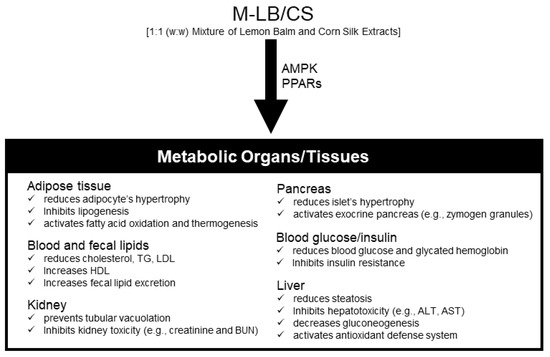 Of the valuable reservoirs of medicinal herbs for reducing oxidative stress, lemon balm (Melissa officinalis L., Lamiaceae family) is a fragrant herb and has been traditionally used for managing mental, cognitive, cardiovascular, and respiratory disorders in Europe and Central Asia [7]. In addition, corn silk (the style and stigma of Zea mays L. fruit) has been traditionally ingested for treating kidney, prostate, and urinary diseases in Asia and the Americas [8]. Diverse flavonoid derivatives (e.g., luteolin, naringin, hesperidin, maysin, and methoxy flavone), volatile compounds (e.g., geranial, neral, citronellal, geraniol, terpinol, citronellol, 6,11-oxidoacor-4-ene, pinocamphone, eugenol, neo-iso-3-thujanol, and sabinene hydrate), triterpenoids (e.g., usolic acid and oleanolic acid), and phenolic acids (e.g., rosmarinic acid and caffeic acid) have been isolated from both parental herbs [7,8]. Based on their potent antioxidant activity, lemon balm and corn silk have been reported to have the potential to prevent (or treat) a variety of diseases, including the metabolic complications of obesity [7,8,9,10,11,12,13].