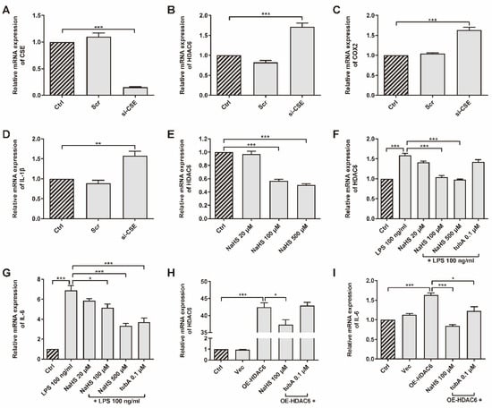 HDAC6 is a H2S-related pro-inflammatory factor in rRAFLS. The gene expression of (A) CSE, (B) HDAC6, (C) COX2, and (D) IL-1β in rRAFLS transfected with scrambled (Scr) or targeting CSE (si-CSE) siRNA for 6 h. (E) Cells in control (Crtl) group and NaHS (20, 100, 500 μM) groups were collected after 6 h treatment and then subjected to qRT-PCR. (F,G) Cells were pre-treated with NaHS (20, 100, 500 μM) and tubA (0.1 μM) for 1 h and then stimulated with LPS (100 ng/mL) for another 5 h. Then, the cells were subjected to qRT-PCR. (H,I) Cells were transfected with vector (Vec) or HDAC6 overexpression plasmid for 6 h and treated with NaHS (100 μM) and tubA (0.1 μM) for another 6 h. Then, the cells were subjected to qRT-PCR. Bars indicate the mean ± SEM. * p < 0.05, ** p < 0.01, *** p < 0.001. n = 3–4 in each group.