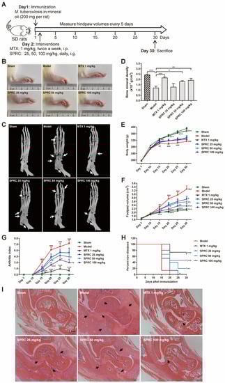 Rats were immunized on day 1 by a subcutaneous injection of M. tuberculosis suspended in mineral oil (4 mg/mL, 50 μL per rat) at the base of the tail. Rats were divided into the following 6 groups: Sham group (subcutaneously injected with saline once and treated with PBS daily, intragastric), Model group (immunized and treated with PBS daily, intragastric), MTX group (immunized and treated with MTX twice a week, 1 mg/kg, intraperitoneal), SPRC groups (immunized and treated with SPRC daily, 25, 50, or 100 mg/kg, intragastric). MTX and SPRC were dissolved in PBS. On day 30, all the rats were sacrificed. The severity of the arthritis was scored every 5 days after day 10. Inflammation of paws were graded from 0 to 4, as follows: grade 0, paws with no swelling and focal redness; grade 1, paws with swelling of finger joints; grade 2, paws with mild swelling of the ankle or wrist joints; grade 3, paws with severe inflammation of the entire paws; grade 4, paws with deformity or ankylosis. Volumes of hind footpads were determined by plethysmometer (Ugo Basile, Varese, Italy).