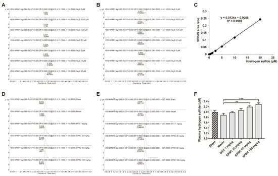 Hence, to further study whether the anti-RA effect exerted by SPRC is related to H2S production, since SPRC can increase CSE expression, we applied HPLC-MS to detect the derivative product, sulfide dibimane (SDB), of S2−/HS−/H2S in rat plasma. In the standard group, Na2S (0–20 μM) generated SDB in a linear manner (Figure 3A,C). The retention times of SDB and internal standard (IS) hydrocortisone were about 3.0 and 3.4 min, respectively (Figure 3A,B,D,E). We found that there was a fluctuation in the model group compared to the sham group, without a significance change (Figure 3F). As shown in Figure 3F, SPRC increased total H2S concentration in rat plasma. These data indicate that SPRC depresses foot swelling and inhibits bone erosion in the AIA animal model, which is positively correlated with H2S production.