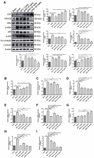 SPRC inhibits the expression of HDAC6 and inactivates NF-κB pathway in AIA rat model. (A) The protein levels of CSE, HDAC6, IκBα, p-IκBα, NF-κB (p65), p-NF-κB (p65), and acetylated (Ac-)α-tubulin in synovium tissues were detected by Western blotting. The gene levels of (B) CSE, (C) HDAC6, (D) IL-1β, (E) COX2, (F) RANKL, (G) OPG, (H) MMP9, and (I) MMP13 in synovium tissues were analyzed by qRT-PCR. MTX 1 mg/kg: twice a week for 30 days, intraperitoneal. SPRC 25/50/100 mg/kg: daily for 30 days, intragastric. Bars indicate the mean ± SEM. * p < 0.05, ** p < 0.01, *** p < 0.001. n = 3–4 in each group.
