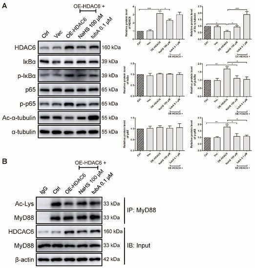 H2S blocks HDAC6-induced MyD88 deacetylation and NF-κB signaling activation in rRAFLS. (A) Immunoblot of the expression of HDAC6, Ac-α-tubulin, IκBα, p-IκBα, NF-κB (p65), and p-NF-κB (p65) in rRAFLS, which were transfected with vector (Vec) or HDAC6 overexpression plasmid OE-HDAC6 for 6 h and treated with NaHS (100 μM) or tubA (0.1 μM) for another 24 h. (B) After the above treatment, cell lysates were immunoprecipitated using anti-MyD88 antibody and the levels of MyD88, HDAC6, and acetylated (Ac) lysines in MyD88 were detected by Western blotting. Bars indicate the mean ± SEM. * p < 0.05, ** p < 0.01, *** p < 0.001. In (A), n = 3 in each group.