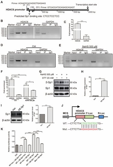 H2S S-sulfhydrates transcription factor Sp1 to inhibit HDAC6 expression in rRAFLS. (A) Predicted Sp1 binding site on HDAC6 promoter and specific HDAC6 primer. (B,D,E) The ChIP–PCR products were analyzed by 3% agarose gel electrophoresis. (C,F) RT-qPCR was applied to quantify fold of enrichment after IP. Cells were treated with NaHS (500 μM) for 12 h in E and F. (G) The protein levels of total Sp1 and S-sulfhydrated Sp1 (S-Sp1) after NaHS (30 min) or DTT (10 min) treatment were detected by Western blotting. (H) The gene and (I) protein levels of Sp1 after transfection with overexpression plasmid (OE-Sp1) for 12 h and 24 h were detected by Western blotting and RT-qPCR, respectively. (J) Illustration for HDAC6 wildtype (WT) and mutant (Mut) promoter cloned and inserted into plasmids. (K) The ratios of dual-luciferase activity were calculated after transfection with WT vector (WT-Vec), WT, or Mut of HDAC6 promoter plasmids together with Sp1 overexpression plasmid (OE-Sp1) or its negative control OE-Sp1-Vec for 6 h. Then, in WT + OE-Sp1 + NaHS group, rRAFLS were treated with NaHS (100 μM) for another 12 h. Bars indicate the mean ± SEM. * p < 0.05, ** p < 0.01, *** p < 0.001. In (C,F,H,I,K), n = 3 in each group.