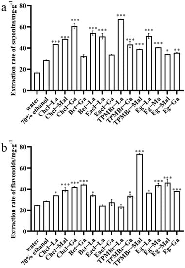 The extraction rate of total saponins and total flavonoids from X. sorbifolia husks using different solvents: (a) the extraction rate of total saponins; (b) the extraction rate of total flavonoids. There is a significant difference when * p < 0.05, ** p < 0.01 and *** p < 0.001 versus 70% ethanol.