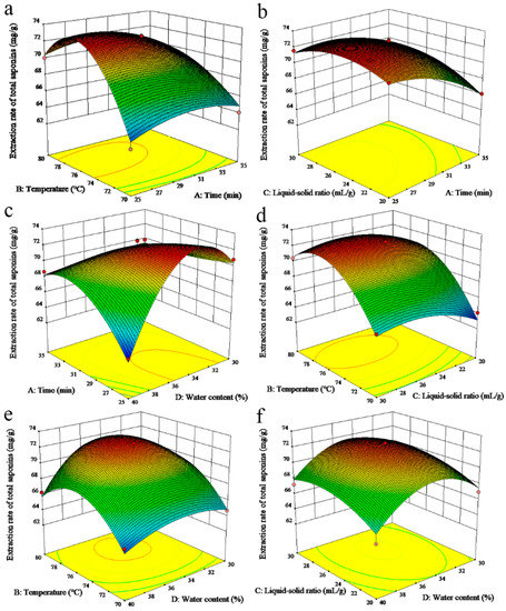 Comprehensive score of the response surface of the total saponins extraction rate. (a) The interaction between extraction time and temperature; (b) the interaction between liquid–solid ratio and extraction time; (c) the interaction between extraction time and water content; (d) the interaction between liquid–solid ratio and extraction temperature; (e) the interaction between water content and extraction temperature; (f) the interaction between water content and liquid–solid ratio.