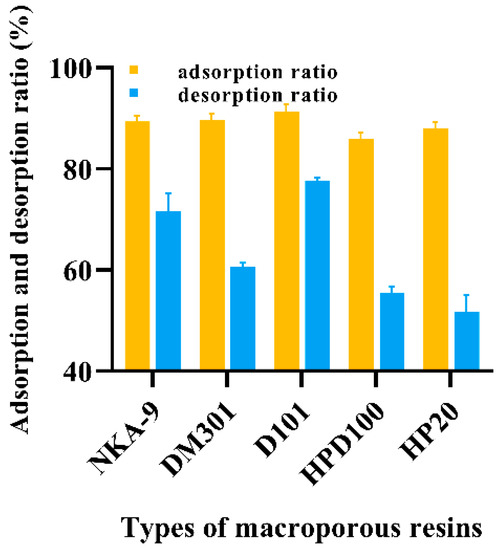 For the efficient recovery of total saponins from TPMBr-La extract solution, we investigated the adsorption and desorption rates of NKA-9, DM301, D101, HPD100, and HP20 macroporous resins. As described in Figure 4, D101, DM301, and NKA-9 macroporous resin displayed a superior adsorption rate (91.41%, 89.62%, 89.34%, respectively), indicating that the total saponin in the TPMBr-La extract can be adsorbed well. In the process of desorption, the D101 macroporous resin showed a better desorption rate (77.74%) for total saponins. The reason that the desorption rate is not particularly high may be attributed to the water-soluble and nonvolatile properties of DESs. Therefore, D101 resin was used to recover total saponins from the TPMBr-La extract solution.